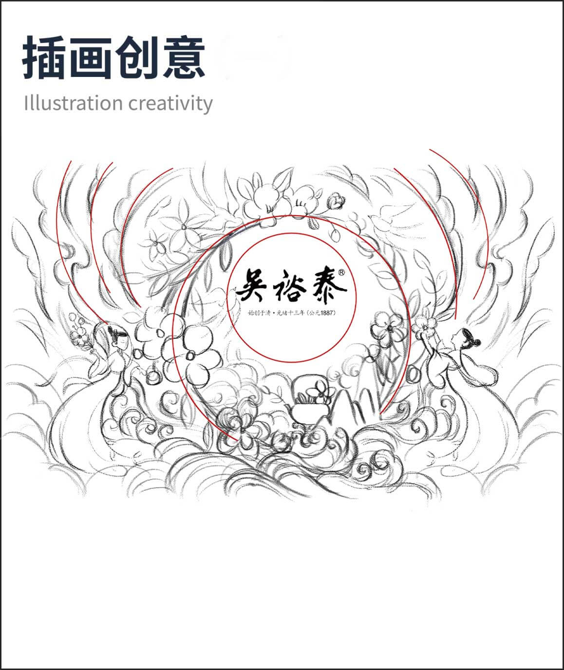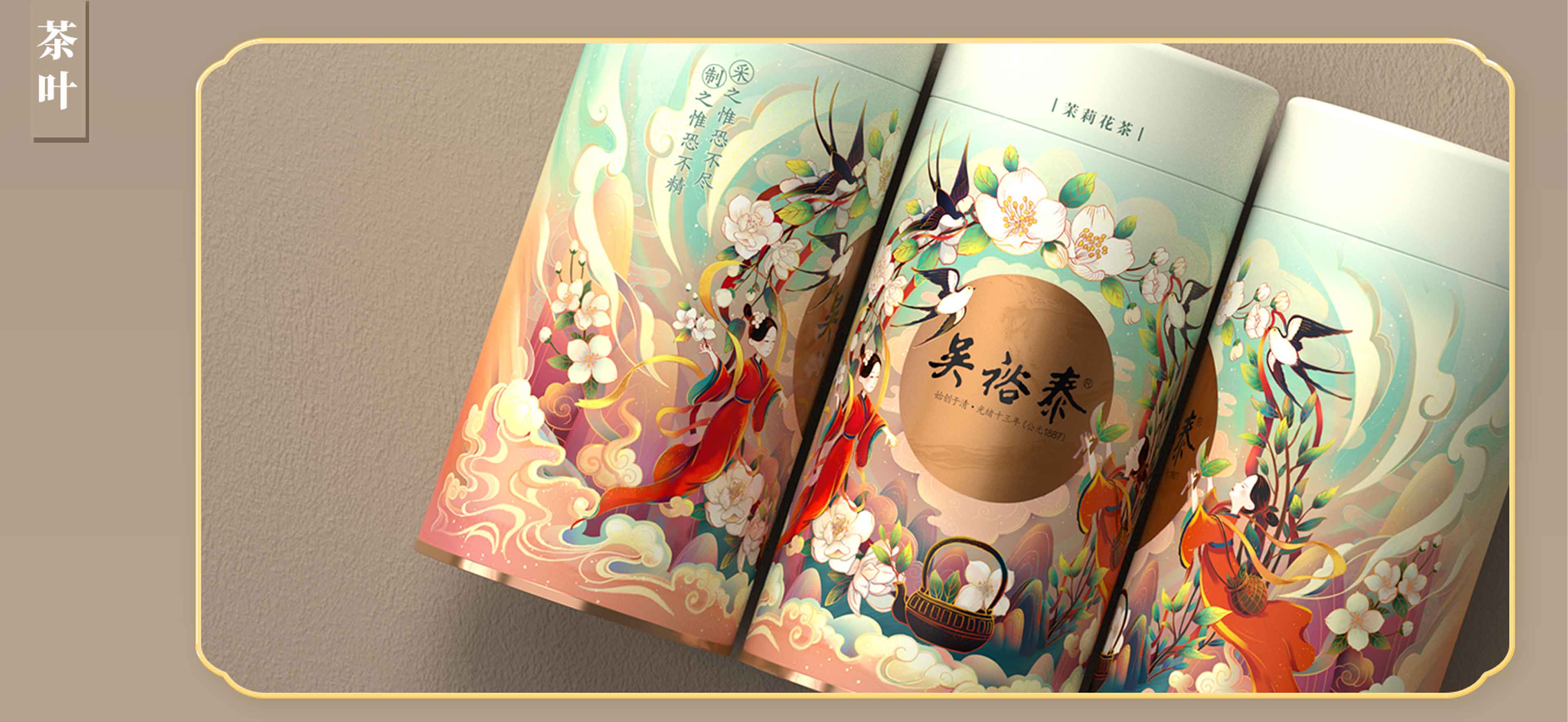 以“茉莉花”為主題元素,進(jìn)行設(shè)計(jì)創(chuàng)作,以國(guó)潮風(fēng)格為基調(diào),輔助山川、流水、茶葉、采茶姑娘、燕子等元素,賦予插畫更多的故事性和閱讀性。