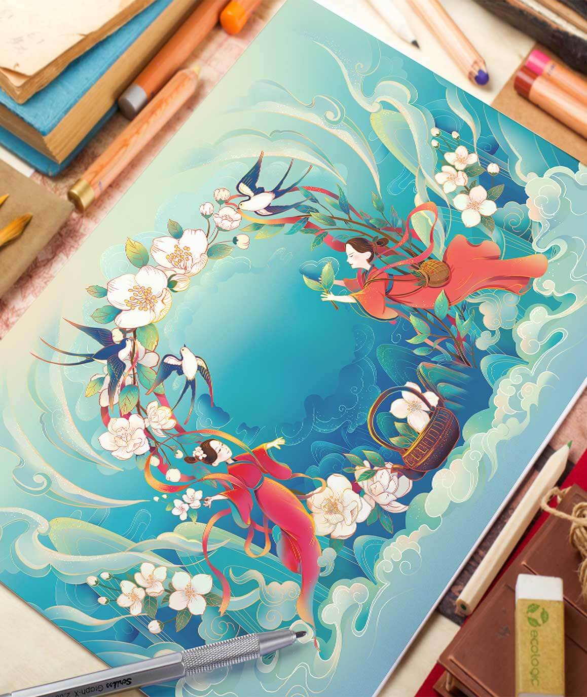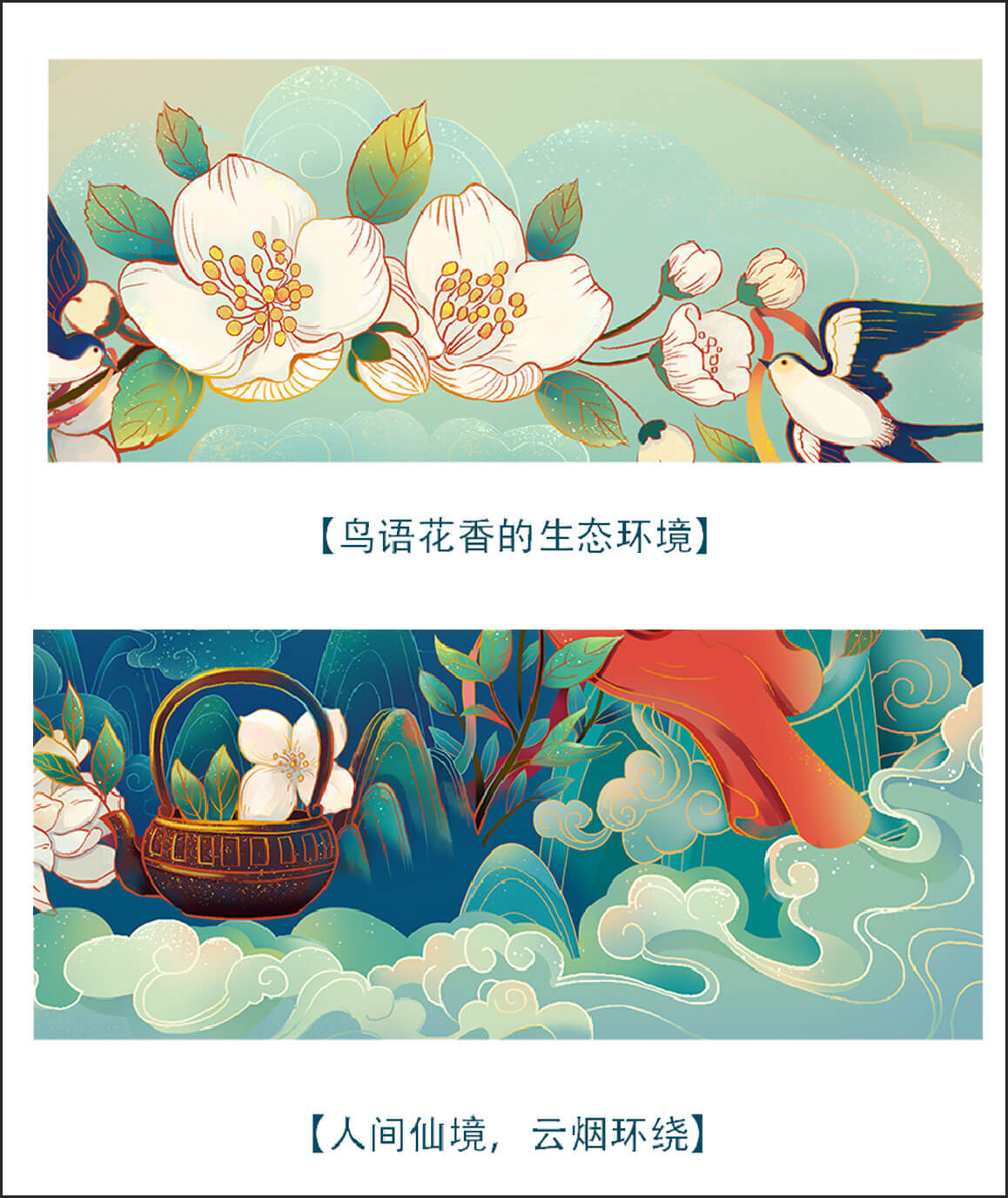 插畫以新國(guó)潮風(fēng)格繪制畫面描繪了“云煙環(huán)繞、鳥語(yǔ)花香"的生態(tài)環(huán)境里采茶與采花的女孩。