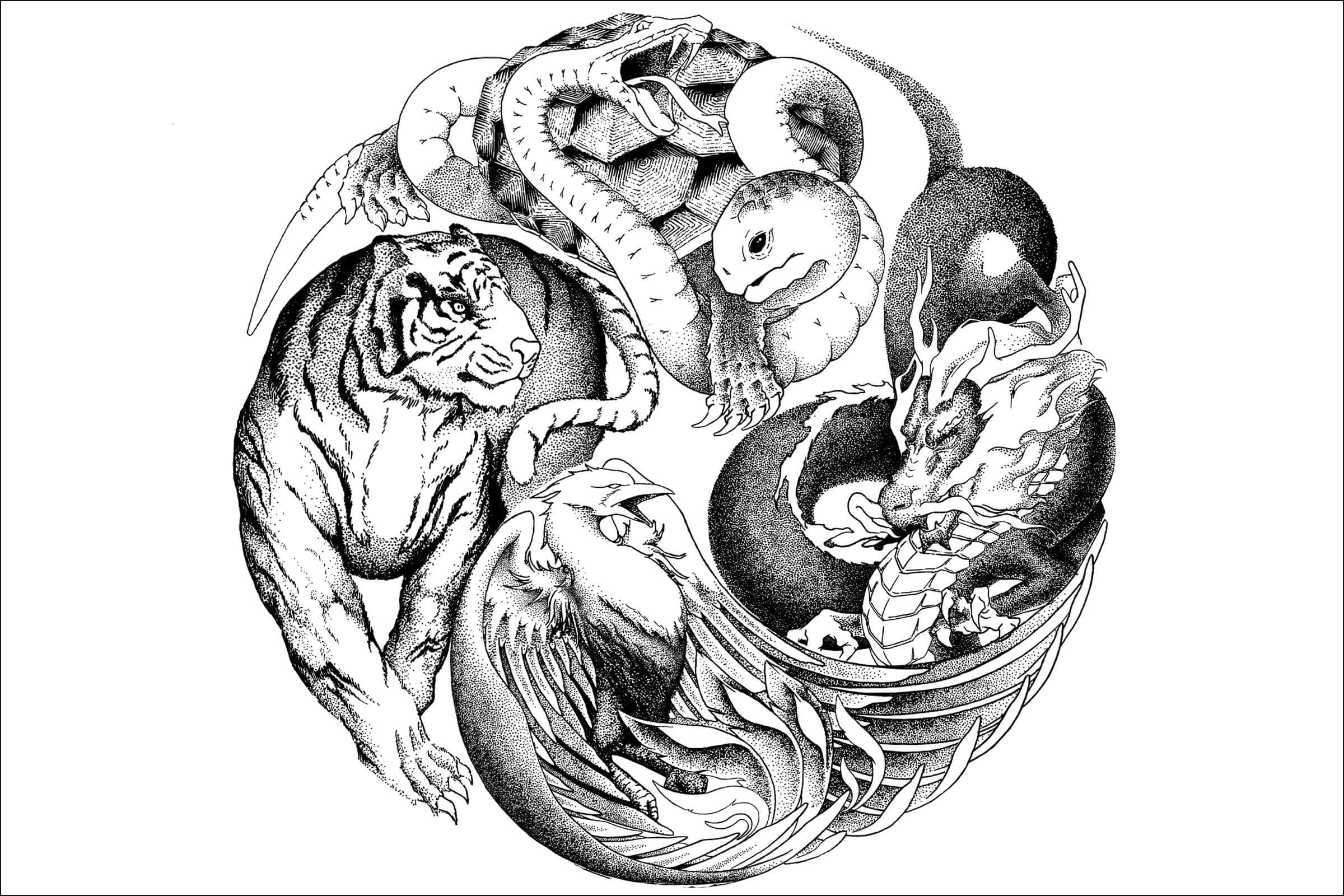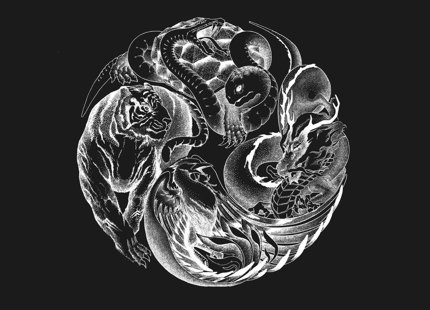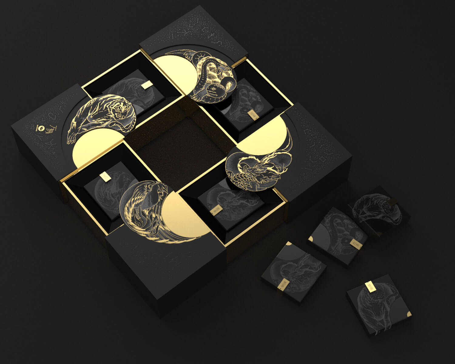 古時中國,人們認為萬物變化皆可借天星卜算,結(jié)合四時變化(春夏秋冬)和四方星宿(東南西北)連綴想象,演變出青龍、白虎、玄武、朱雀四象靈物,象征萬象演化,陰陽轉(zhuǎn)換。用四大神獸作為超級視覺符號,采取太極陰陽結(jié)合的展現(xiàn)方式,重新構(gòu)造了四象IP與現(xiàn)代飲茶的生活。