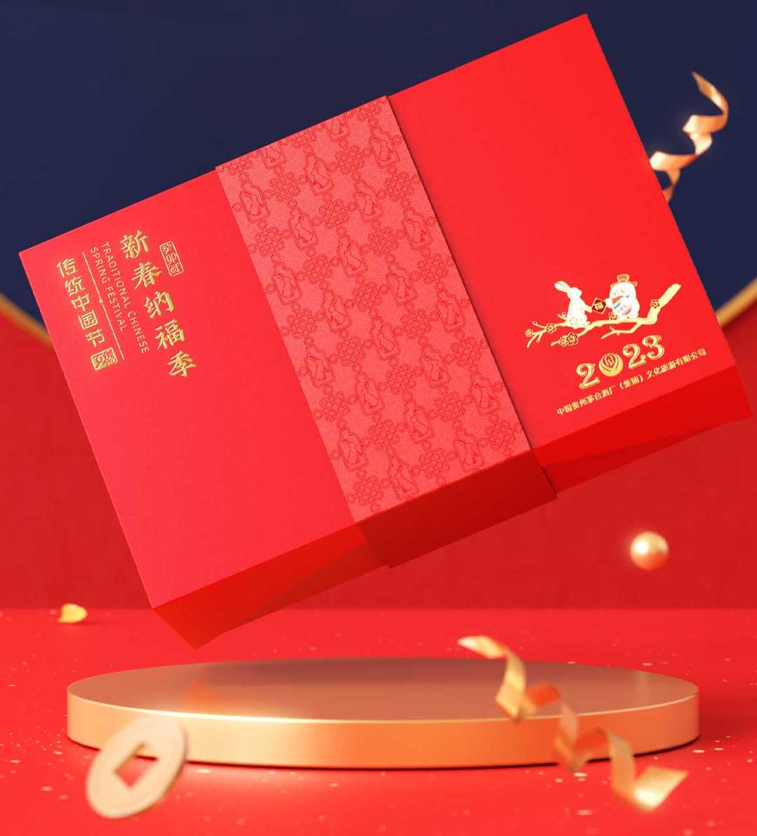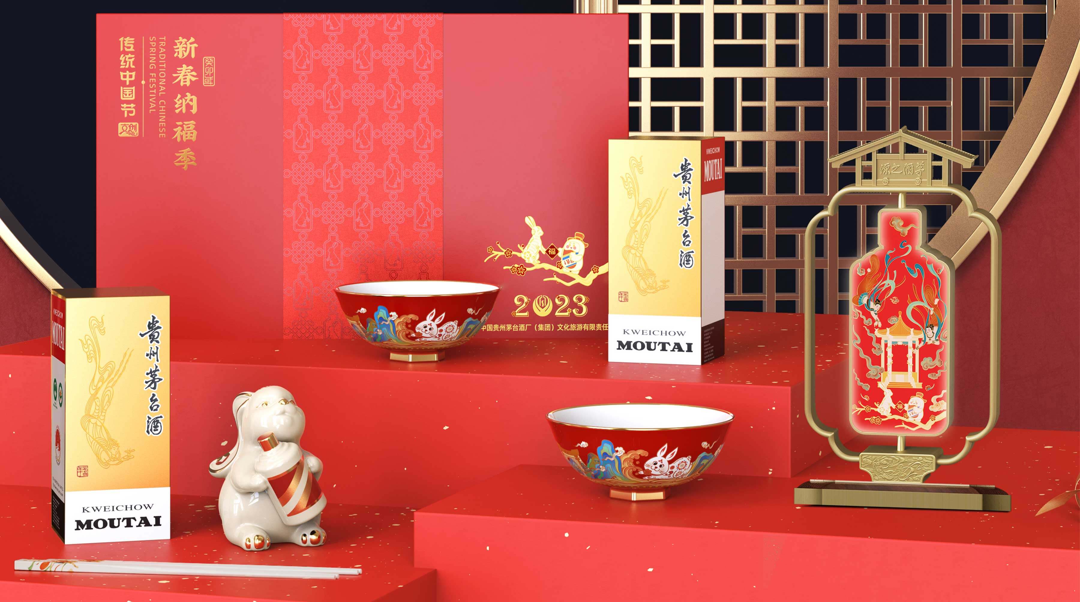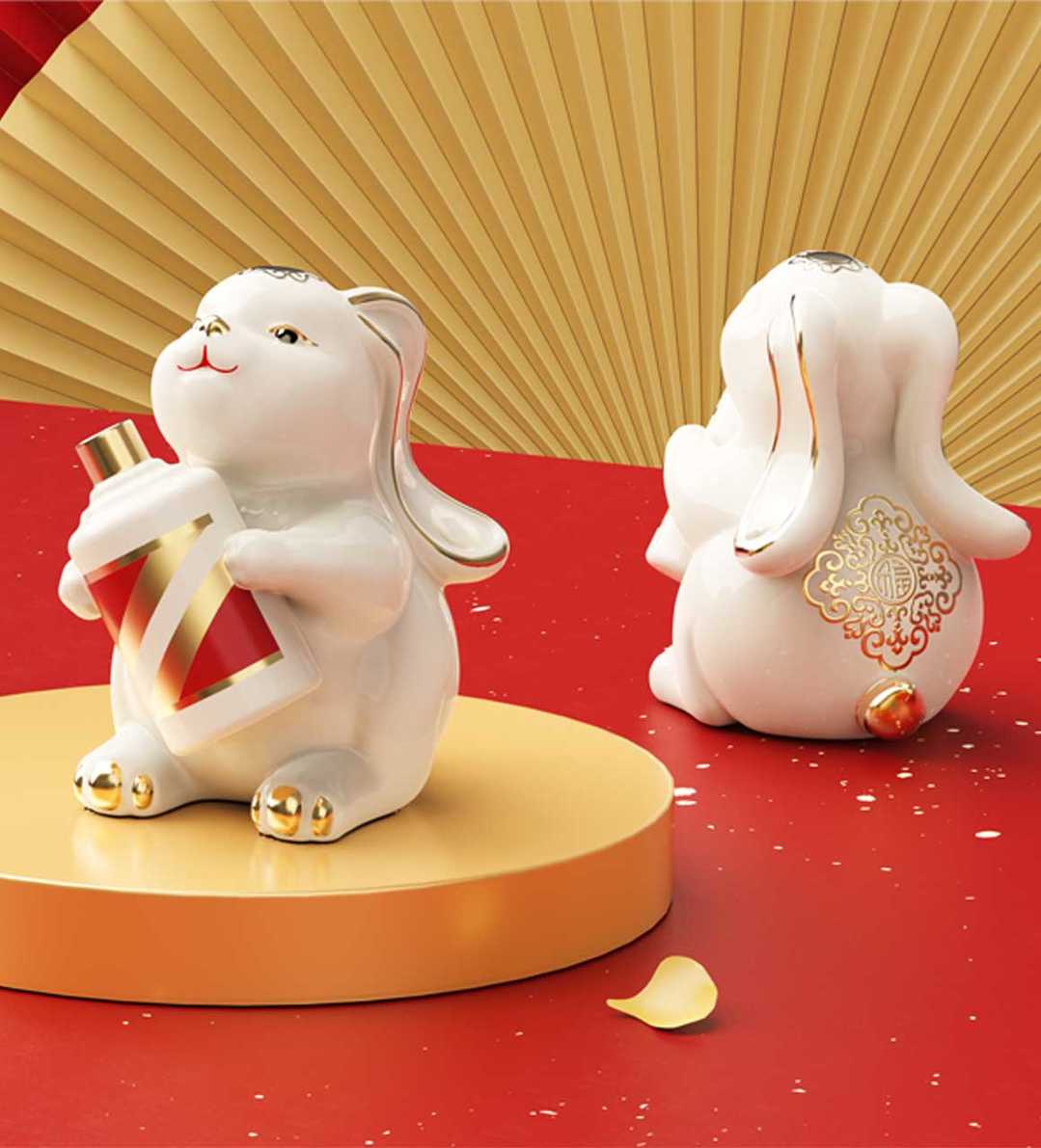 吉祥的玉免視覺手執(zhí)新春梅花傳承非遺剪紙技藝,傳遞新春的喜悅與祝福,赤水河環(huán)繞在碗底,寓意福水長流楊柳灣古井、茅臺正大門青綠山水之間,躍然于碗邊傳遞著深厚的茅臺文化,圓碗方底,方圓結(jié)合,更顯古韻。