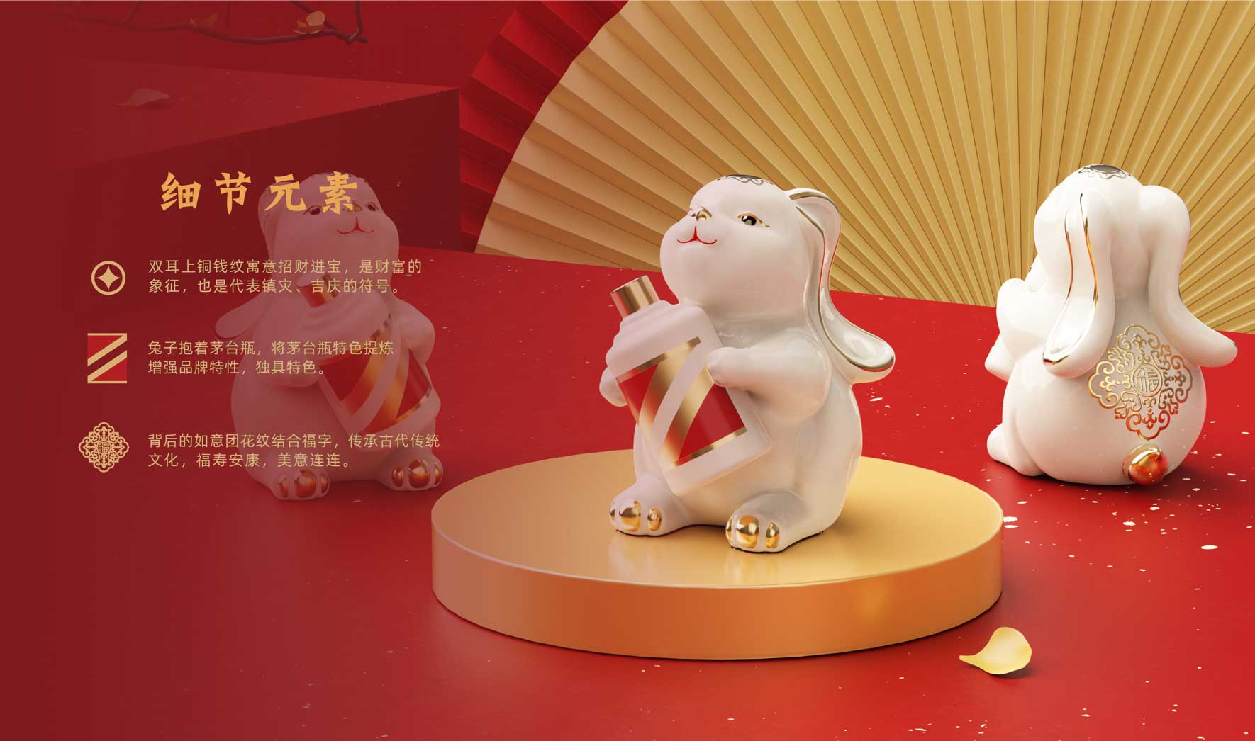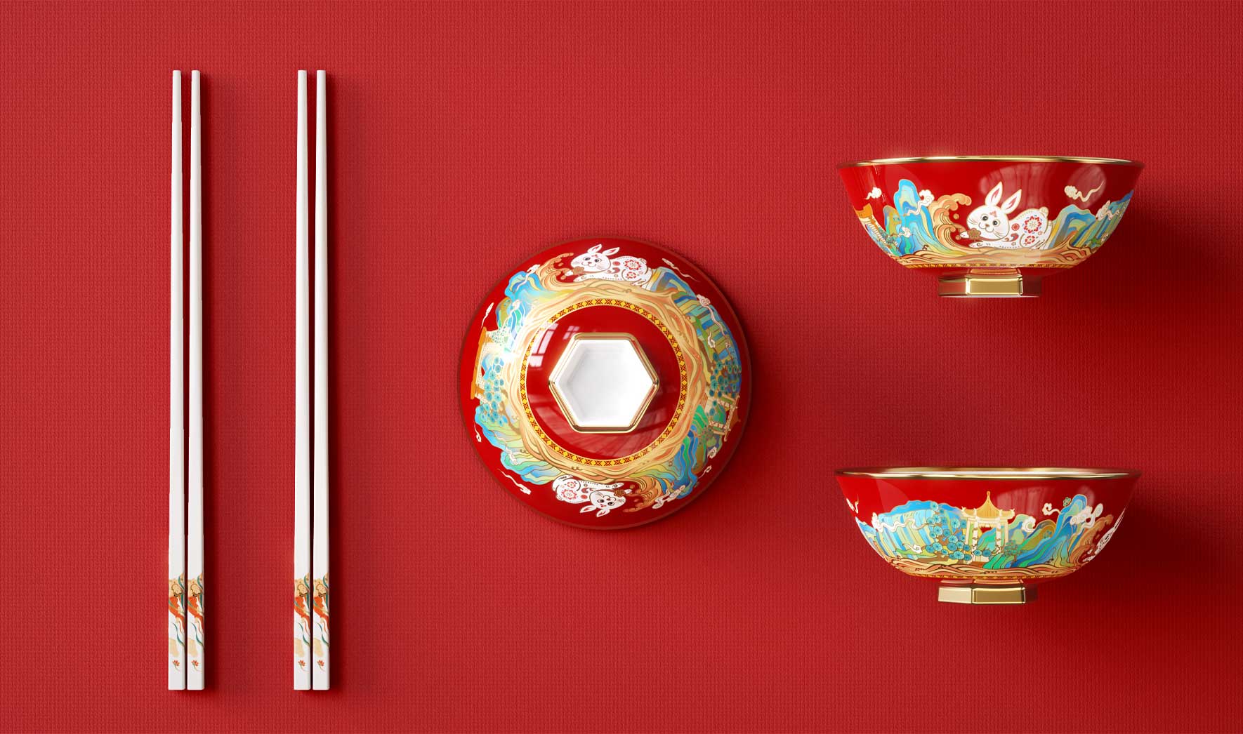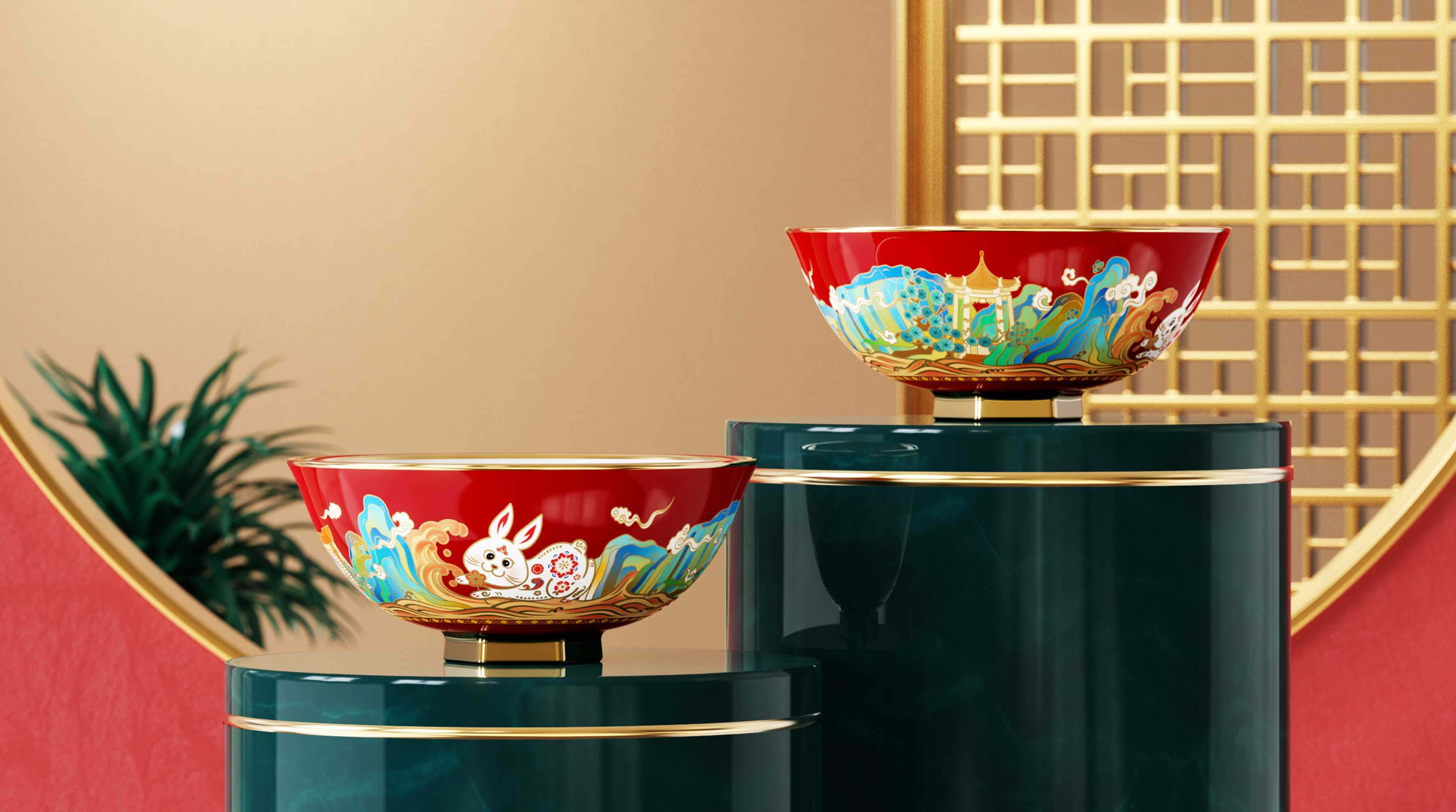 吉祥的玉免視覺手執(zhí)新春梅花傳承非遺剪紙技藝,傳遞新春的喜悅與祝福,赤水河環(huán)繞在碗底,寓意福水長流楊柳灣古井、茅臺正大門青綠山水之間,躍然于碗邊傳遞著深厚的茅臺文化,圓碗方底,方圓結(jié)合,更顯古韻。