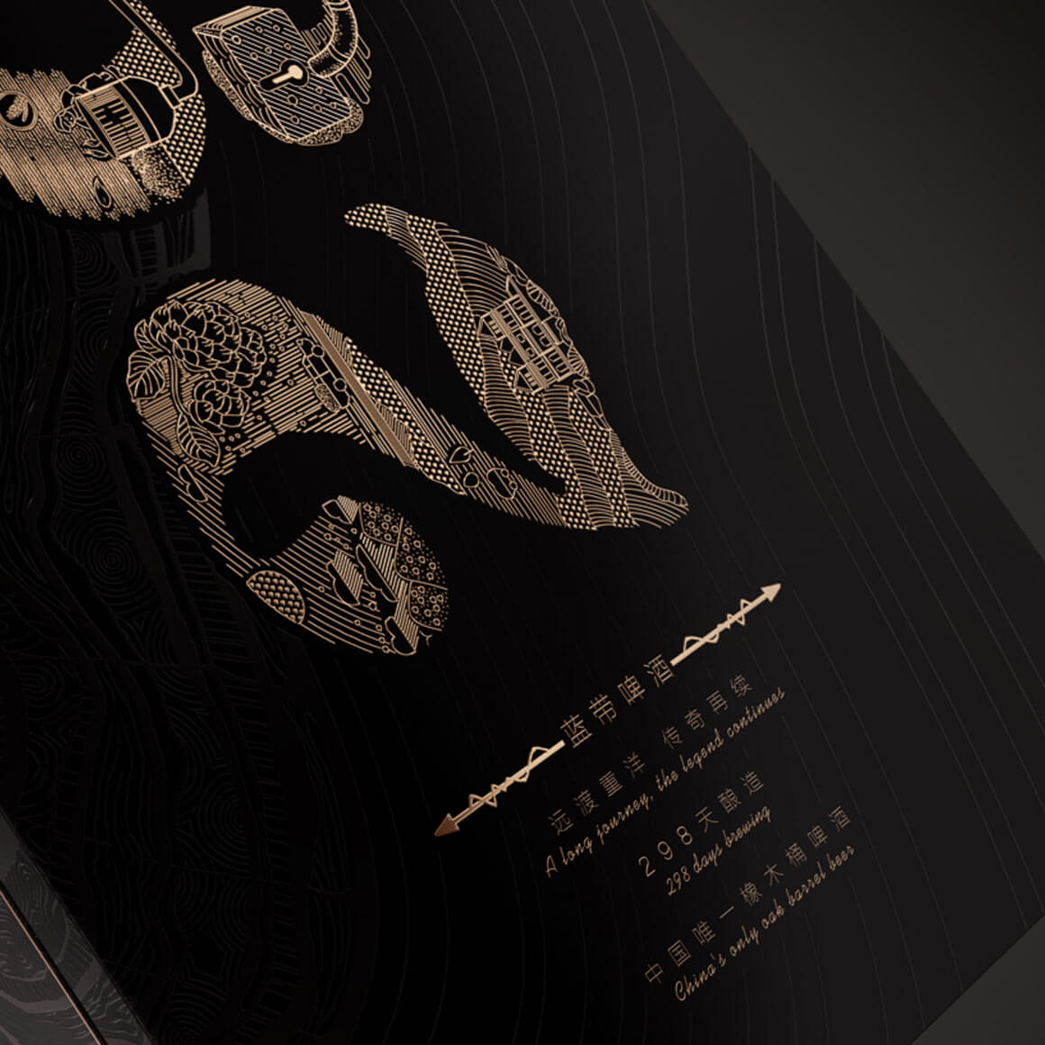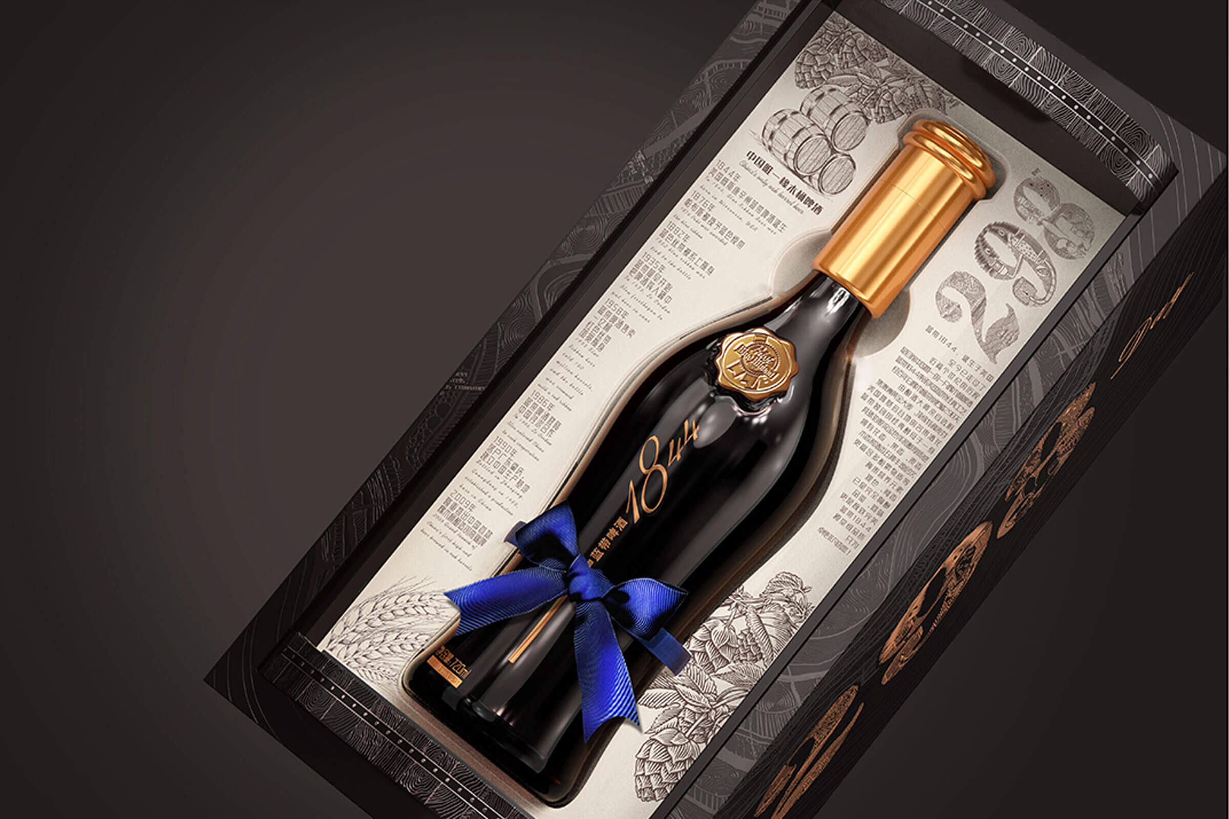 基于藍(lán)帶啤酒的品牌理念及核心價(jià)值,整個(gè)禮盒仿照了橡木桶釀造的感覺,采用了旋轉(zhuǎn)開啟的盒型,內(nèi)盒上下底座的木紋和柳釘燙金工藝的高級(jí)感,隨著旋轉(zhuǎn)禮盒而呈現(xiàn)藍(lán)帶1844啤酒緩緩轉(zhuǎn)身,如同走過(guò)百年歷史面向今天的消費(fèi)者。