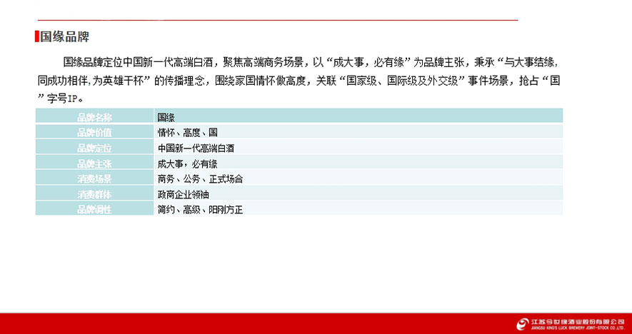 國緣定位中國新一代高端白酒,聚焦高端商務(wù),以“成大事,必有緣”為主張,借家國情懷關(guān)聯(lián)“國家級”等場景搶占“國”字號IP 。