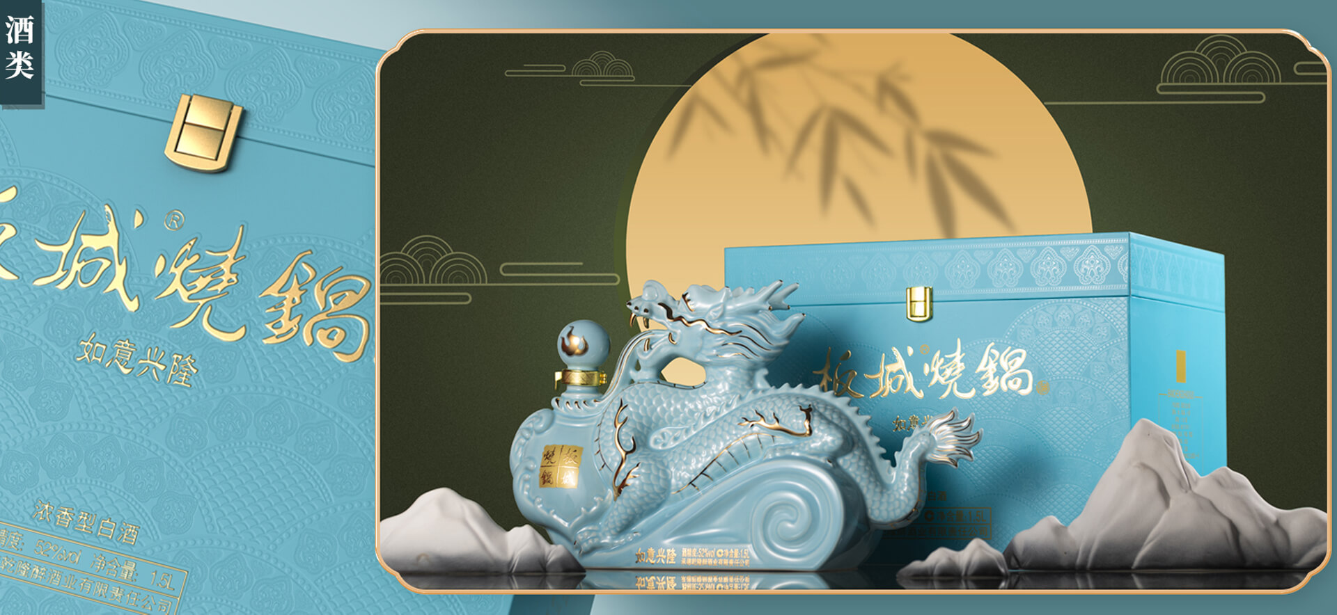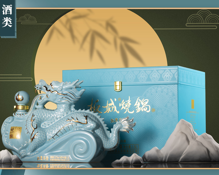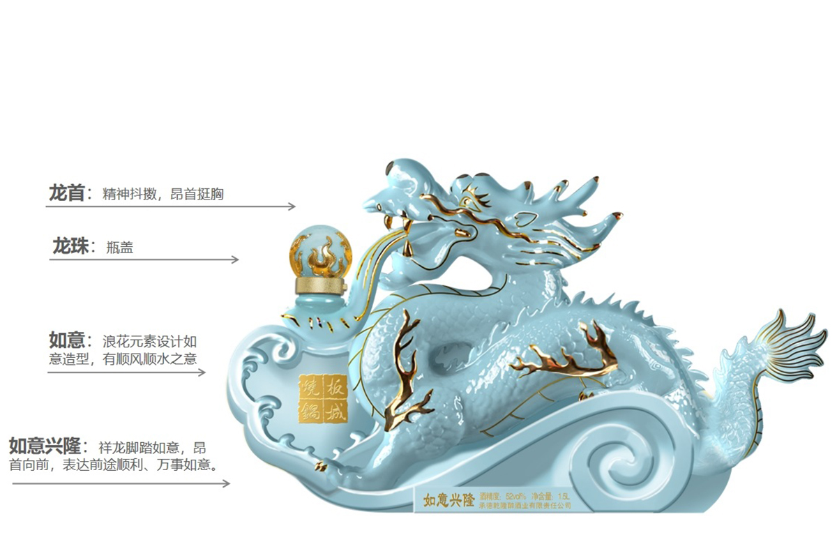 汝窯天青色+雅金純凈柔和的天青色+典雅的金色,以珍貴的汝窯天青色來塑造板城龍年生肖酒的珍貴性,收藏性。