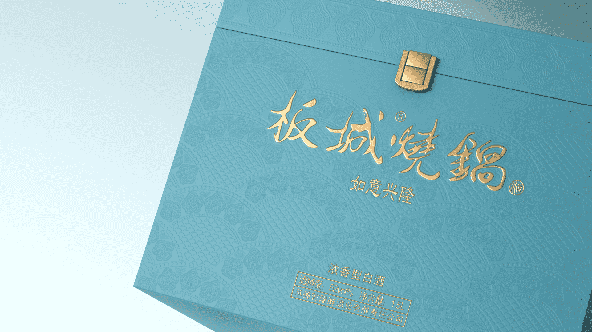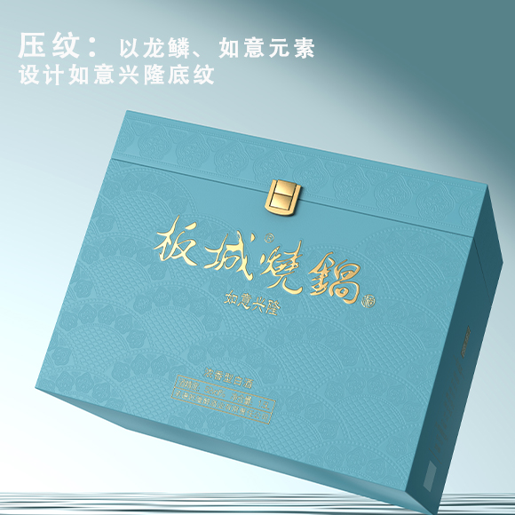 板城燒鍋如意興隆生肖酒外包裝的創(chuàng)作上,以龍鱗、如意元素細節(jié)作為底紋設計主視覺,并以壓紋工藝輔助呈現(xiàn)。
