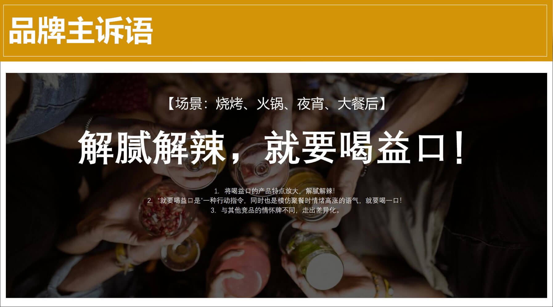 1.將喝益口的產(chǎn)品特點(diǎn)放大,解膩解辣!