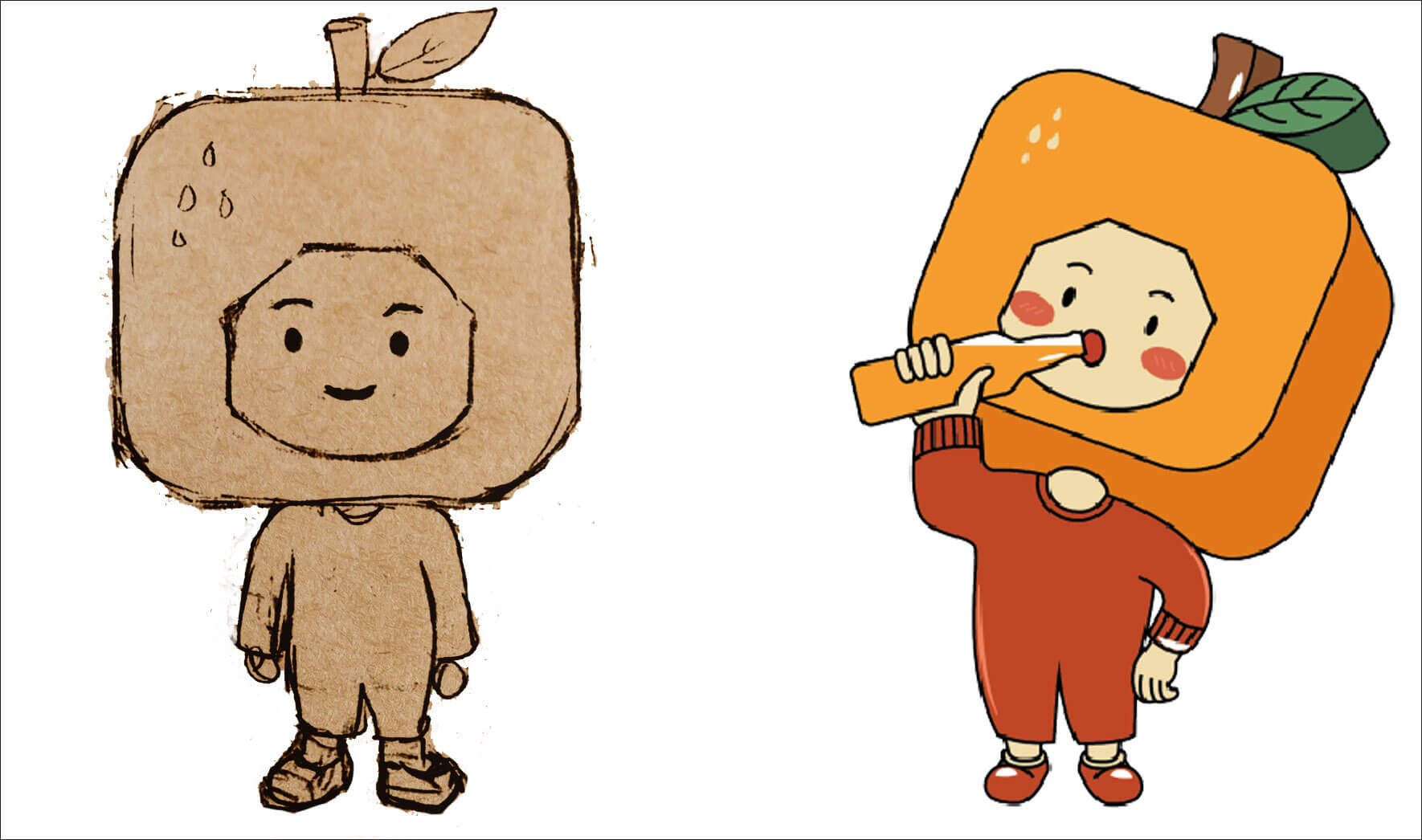 整體IP形象是一個(gè)戴著水果頭套,身穿連體衣喝汽水的造型。頭大身小看起來更顯萌態(tài),頭套后期可延展性強(qiáng),方形水果與市面形成差異化。色彩方面采用苔綠+米黃的配色。