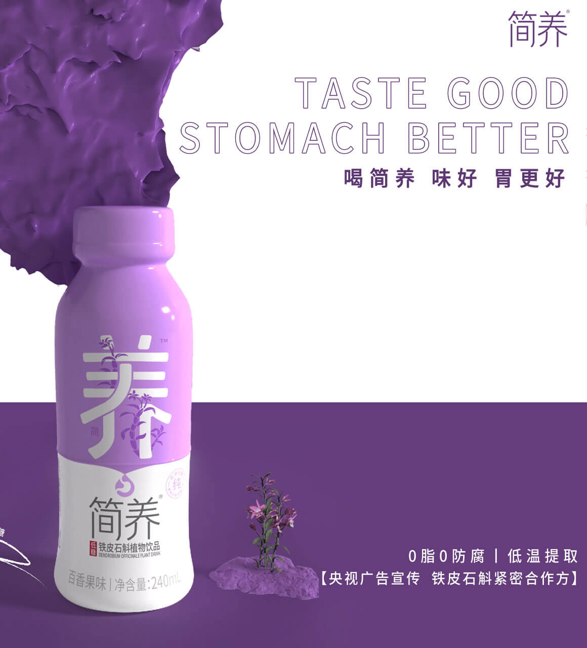 在產(chǎn)品設計構思上我們以畫面中心為分割線,一口“簡養(yǎng)”飲品持續(xù)養(yǎng)護你的“胃”,飲品也在分割處剛好滴落下來,有一種溢出來的視覺感受。