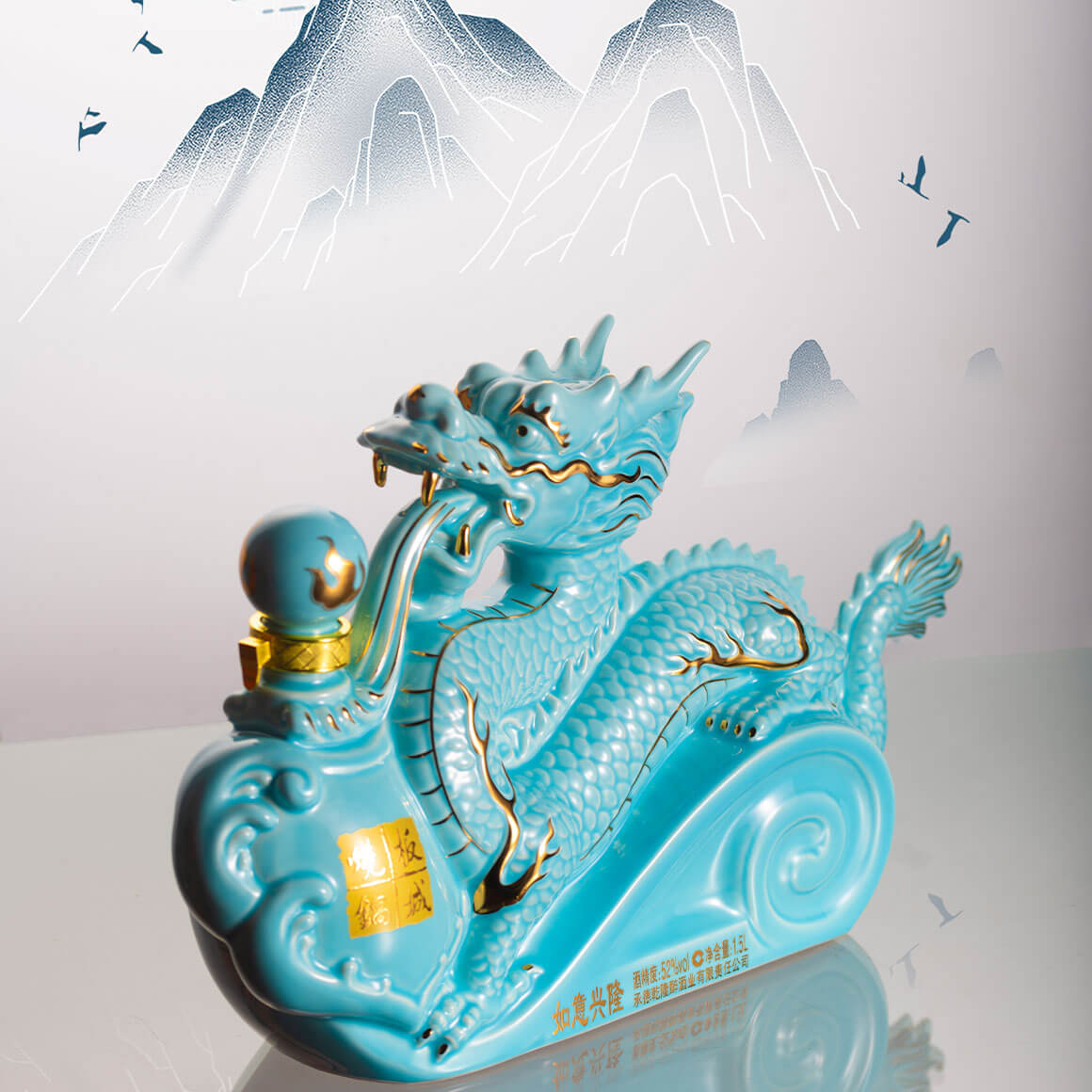 純凈柔和的天青色+典雅的金色,以珍貴的汝窯天青色來(lái)塑造板城龍年生肖酒的珍貴性,收藏性。